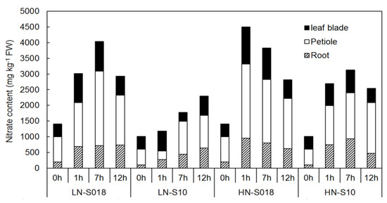 The nitrate contents generally differed between the two spinach varieties and two nitrate concentration treatments (Figure 2). The nitrate contents in the whole plant of So18 were significantly greater than those in So10 at each treatment time, irrespective of the applied nitrate concentration. Among all treatments, the nitrate contents in leaf petioles were significantly greater than roots and leaf blades, except for the leaf petioles under low nitrate treatment at 1 h. Applying a greater nitrate concentration generally increased the whole plant nitrate contents for both varieties, except for So18 at 7 h and 12 h.
