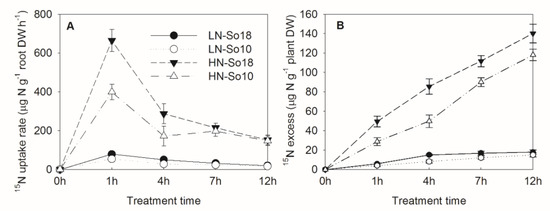 The differences of 15NO3−-N uptake rates and 15NO3−-N excess between two varieties were significant at 1–4 h and 1–12 h (except those treated with a low nitrate concentration for 1 h), respectively. The So18 15NO3−-N uptake amount was higher by 18.9% (low nitrate treatment) and 18.7% (high nitrate treatment) compared to So10 within 12 h, which suggested that So18 has a greater capacity for nitrate uptake from nutrient solution.