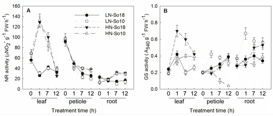 The dynamics of GS activities were more complex than those of NR. Generally, leaf blade GS activities of So18 were higher than those of So10 under both nitrate treatments. In petioles, the GS activities of two spinach varieties showed opposite trends in proportion to treatment time under both nitrate treatments. The petiole GS activities of So10 first increased at 1 h and were higher than those of So18 at 1 h, before decreasing at 12 h and becoming lower than those of So18. Under low nitrate conditions, root GS activities first increased then decreased at 12 h for both varieties, while this was reversed under high nitrate conditions. The So10 GS activities were generally higher than those of So18 under low nitrate conditions, while under high nitrate treatment, they did not differ from those of So18 at 1 h and were lower than those of So18 at 12 h.