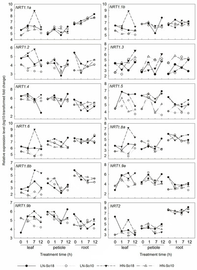 The tested genes displayed distinct expression patterns among different nitrate concentrations, tissues, treatment times and varieties (Figure 5, Figure 6 and Figure 7). Most of the tested gene transcripts were induced by high nitrate although their increases depended on treatment times and varieties (Figure S1). The relative expression levels of SoNRT1.1a, SoNRT1.1b, SoNRT1.3, SoNRT1.4, SoNRT1.6, SoNRT1.8a, SoNRT1.8b and SoNRT1.9a were at most 100–1000 times greater in varieties under high nitrate conditions than those under low nitrate conditions. SoNRT1.1a, SoNRT1.1b, SoNRT1.6, SoNRT1.8a, SoNRT1.8b, SoNRT2, SoNIA and SoGLN1 were mainly expressed in roots, while SoNRT1.4, SoNRT1.5, SoNRT1.9a, SoNRT1.9b and SoGLN2 were more abundant in leaf blades and petioles compared to roots (Figure 5). The expression level of all the tested genes varied along with the treatment time (Figure 6 and Figure 7).