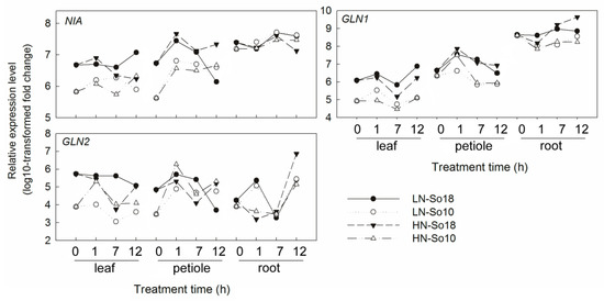 Expression analysis of nitrogen assimilation genes in leaf blades, petioles and roots of two spinach varieties under two concentrations (0.5 and 15 mmol·L−1) of nitrate treatments by qRT-PCR. All values represent the averages of three replicates (see Supplementary Table S1 for details). LN-So18, So18 treated with low nitrate concentration; LN-So10, So10 treated with low nitrate concentration; HN-So18, So18 treated with high nitrate concentration; and HN-So10, So10 treated with high nitrate concentration.