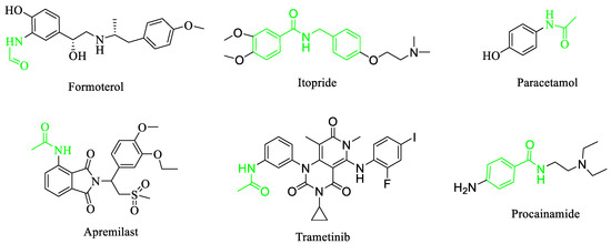 Formamide and acetamide are common organic fragments in organic compounds. An amide bond is considered to be one of the most important linkages from a medicinal point of view [1,2,3,4]. In addition, amide is also an important structural core of many FDA approved drugs, such as formoterol [5], itopride [6], trametinib [7], apremilast [8], paracetamol [9], and procainamide [10] (Figure 1). Therefore, finding new methods of amidation would definitely be of major benefit for the drug discovery process. Generally, the classical method of preparing acetamide involves the reaction of an amine with a carboxylic acid derivative [11,12,13]. Alternatively, transamidation has been proved to be an attractive tool and represents one of the most convenient and straightforward methods for the preparation of acetamide [14].