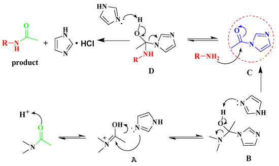 Based on our experimental results and previous studies [38], a plausible mechanism is proposed in Scheme 2. Firstly, DMA was activated by H+ to afford intermediate A, which was attacked by imidazole, resulting in the formation of intermediate B; HNMe2 was removed, leading to the formation of the key intermediate C. Next, nucleophilic addition of the primary amine generates a tetrahedral intermediate D which undergoes an elimination of imidazole to afford the target compound.