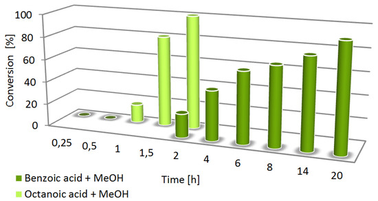 The effect of reaction time on the efficiency of esterification of benzoic (1) and octanoic acid (2) with methanol in the presence of 7 mol% of NBS at 70 °C.