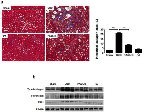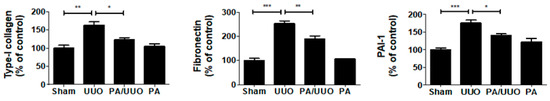 Consistent with the changes in the glomerulus, Masson’s trichrome staining showed that the PA/UUO group exhibited a marked reduction from the increased collagen deposition levels observed in the UUO group (Figure 2a). A similar suppressive effect on collagen and ECM deposition was confirmed by immunoblot analysis (Figure 2b). The PA/UUO group exhibited strongly attenuated type-I collagen, fibronectin, and PAI-1 expression as compared to the UUO group. This indicates that PA may attenuate obstructive nephropathy in vivo.
