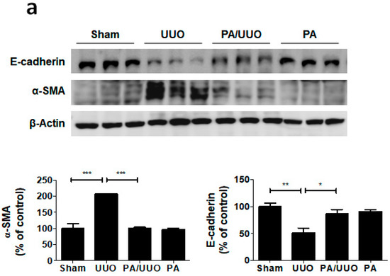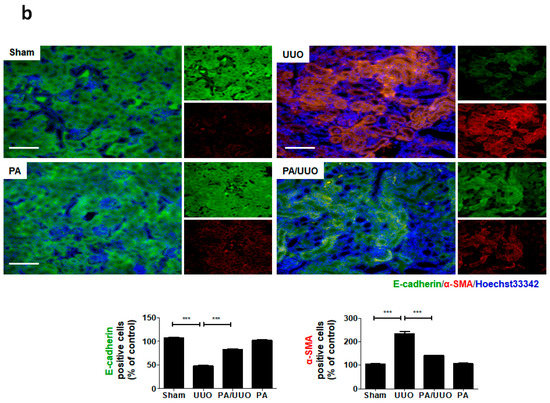A key feature of renal fibrosis, EMT is characterized by the loss of intracellular epithelial adhesion molecules (E-cadherin) and the generation of mesenchymal phenotypes (α-SMA) [16]. As shown in Figure 3a, the UUO group exhibited downregulation of E-cadherin and upregulation of α-SMA occurred, whereas the PA/UUO group exhibited increasing resistance to the progression of EMT. This resistance to the progression of EMT was also confirmed by immunofluorescence staining. The Sham and PA group observed expression of E-cadherin localized at the cell border and low levels of α-SMA expression (Figure 3b). The UUO group exhibited a loss of E-cadherin accompanied by an increased α-SMA expression. The PA/UUO group observed resistance of UUO-mediated EMT progression.