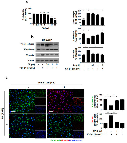 The above data demonstrates that PA inhibited obstructive nephropathy in vivo. To further investigate the role of PA in kidney fibroblast activation, we administered PA to a TGF-β1-treated rat interstitial fibroblast cell line (NRK-49F). First, to determine the cytotoxic effect of PA on the activation of NRK-49F cells, we treated them with PA for 24 h and then conducted MTT assays. We found that PA exhibited mild growth inhibitory activity with a 10% decrease in cell proliferation at 5 μM (Figure 4a). Subsequent experiments were performed using non-toxic PA concentrations of 0.5, 1 and 5 μM. As shown in Figure 4b, the TGF-β1 treatment stimulated type-I collagen expression. In addition, downregulation of E-cadherin and upregulation of vimentin occurred. The PA abrogated the TGF-β1-mediated upregulation of type-I collagen and fibronectin, and cellular resistance to the expression of EMT markers, in a dose-dependent manner.