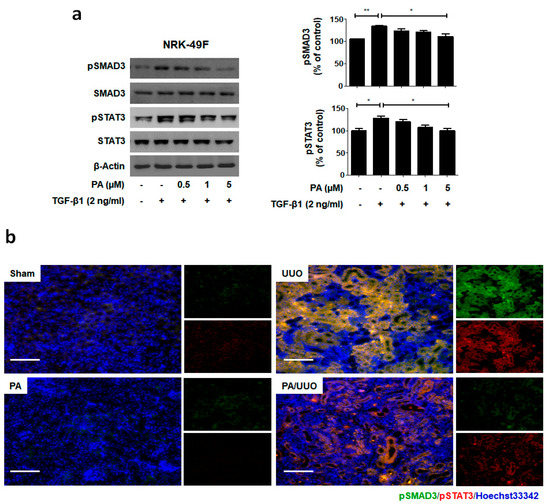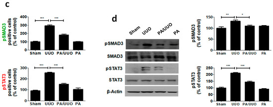 To clarify the molecular mechanism underlying the action of PA in our UUO model, we investigated whether it altered the SMAD3-STAT3 signaling involved in renal fibrosis. The PA/UUO group exhibited significantly suppressed expression of pSMAD3 and pSTAT3 compared to the UUO group (Figure 5b). This similar suppressive effect of PA on pSMAD3 and pSTAT3 expression was confirmed using immunoblotting (Figure 5c). These results demonstrate that PA efficiently downregulates SMAD and STAT activation, resulting in a lasting reduction of phosphorylation in obstructive nephropathy.