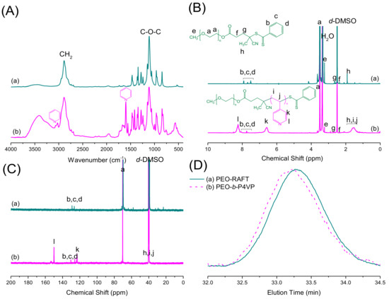 (A) FTIR, (B) 1H, (C) 13C-NMR, and (D) GPC analyses of (a) PEO-RAFT and (b) PEO-b-P4VP.