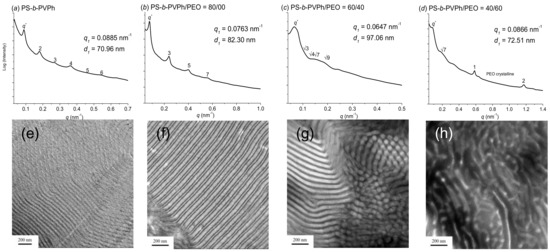 Figure 4 shows SAXS and TEM analyses for the PS-b-PVPh/PEO blend system with various PEO compositions at room temperature. Pure PS-b-PVPh displayed a lamellar structure long range order as displayed in Figure 4a from the scattering peak ratios of 1:2:3:4:5:6, which could be confirmed by the TEM image (Figure 4e). As the PEO composition was increased to 20 wt%, the lamellar structure still remained, with a scattering ratio of 1:3:5:7, which is also consistent with the TEM image (Figure 4f). Since the even-order peaks (such as 2, 4, and 6) almost disappeared, it implied that the PS volume fraction is close to 0.5 in this case (fPSv = 0.51 at this blend composition). Furthermore, the first scattering peak was shifted to a relatively lower value, from q = 0.0885 nm–1 (d = 70.96 nm) to q = 0.0763 nm−1 (d = 82.30 nm), suggesting an increase of the block copolymer spacing. This phenomenon could also be explained by the fact that the PS block segment goes from an asymmetric to a symmetric composition, suggestion that the PEO segment could be dissolved in the PVPh block segment through intermolecular hydrogen bonding interactions and change the volume fraction of the block copolymer. Furthermore, the SAXS peak ratio was observed at 1:√3:√4:√7:√9, representing the hexagonally packed cylindrical nanostructure at 40 wt% PEO composition as displayed in Figure 4c, and confirmed by the TEM image (Figure 4g). The first scattering peak was further shifted to a lower q value (q = 0.0647 nm–1, d = 97.06 nm), also suggesting the increase of block copolymer spacing. However, it displayed wormlike or disordered micelle structures at 60 wt% PEO composition, where the first scatting peaks was observed and the broad peak ratio of √7, as displayed in Figure 4d, as confirmed by the TEM image (Figure 4h). Furthermore, we also observed a crystalline lamellar structure for peak ratio of 1:2 where the q value of (q1 = 0.58 nm−1, d = 10.82 nm, q2 = 1.16 nm−1, d = 5.41 nm) and thus the self-assembly structure from miscible PVPh/PEO phase also competed with the crystallization behavior of the PEO domain in this case. Overall, we could conclude that the PS-b-PVPh/PEO blends also display the wet-brush behavior where KA = 280 of PVPh/PEO is stronger than the KB = 66.8 of PVPh, which is consistent with our previous proposed scheme. However, it did not display a full order-order morphological transition, probably because of the relatively weaker intermolecular hydrogen bonding strength as compared with strong PVPh/P4VP blend system (KA = 1200) [11,12,13,42,43,44,45].