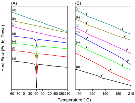 DSC analyses of PS-b-PVPh/PEO-b-P4VP mixtures of range from (A) −60~210 °C, and (B) 80~210 °C for (a) 100/0, (b) 90/10, (c) 70/30, (d) 50/50, (e) 30/70, (f) 10/90, and (g) 0/100.
