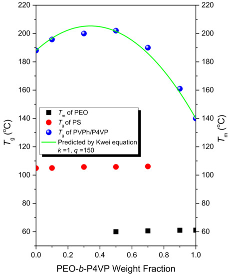 Figure 6 summarizes Tg behavior of the PS domain and PVPh/P4VP domain and Tm behavior of the PEO domain for PS-b-PVPh/PEO-b-P4VP blends. Clearly, the Tg value of PS domain and Tm value of PEO domain almost did not change with the various blend compositions; however, the Tg value of PVPh/P4VP domain displayed positive deviations based on the linear rule and these values could be predicted by the Kwei equation for strong hydrogen bonded blend systems [47]: