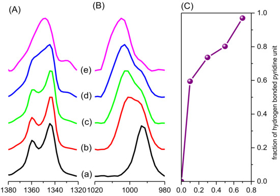 FTIR analyses of PS-b-PVPh/PEO-b-P4VP mixture of (A) CH2 wagging, (B) pyridine vibration of (a) 0/100, (b) 10/90, (c) 30/70, (d) 50/50, (e) 70/30, and (C) fraction of hydrogen bonded pyridine unit with different PS-b-PVPh weight fractions.