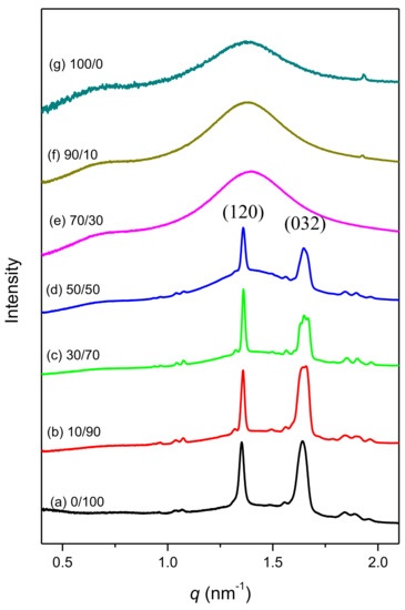 WAXD analyses of PS-b-PVPh/PEO-b-P4VP mixture at room temperature of (a) 0/100, (b) 10/90, (c) 30/70, (d) 50/50, (e) 70/30, (f) 90/10, and (g) 100/0.