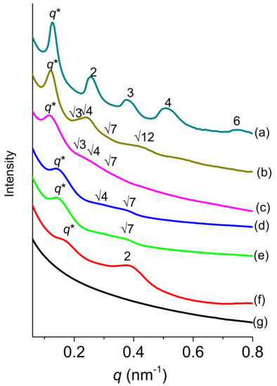 SAXS analyses of PS-b-PVPh/PEO-b-P4VP mixture at room temperature of (a) 0/100, (b) 10/90, (c) 30/70, (d) 50/50, (e) 70/30, (f) 90/10, and (g) 100/0.