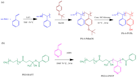 Synthesis of (a) PS-b-PVPh by sequential anionic living polymerization and (b) PEO-b-P4VP by RAFT polymerization.