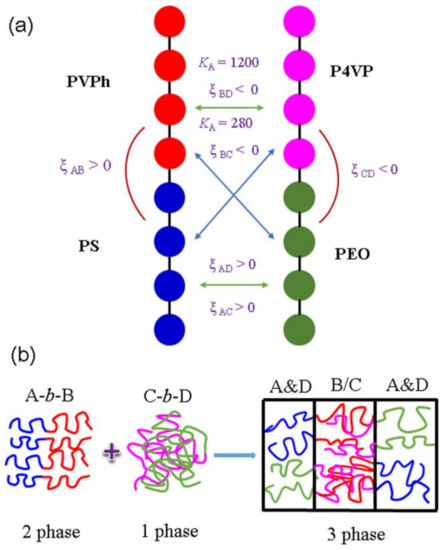 - Chen, W.C. , Kuo, S.W., Chang, F.C. Self-assembly of an A–B diblock copolymer blended with a C homopolymer and a C–D diblock copolymer through hydrogen bonding interaction. Polymer 2010, 51, 4176–4184. [Google Scholar] [CrossRef]