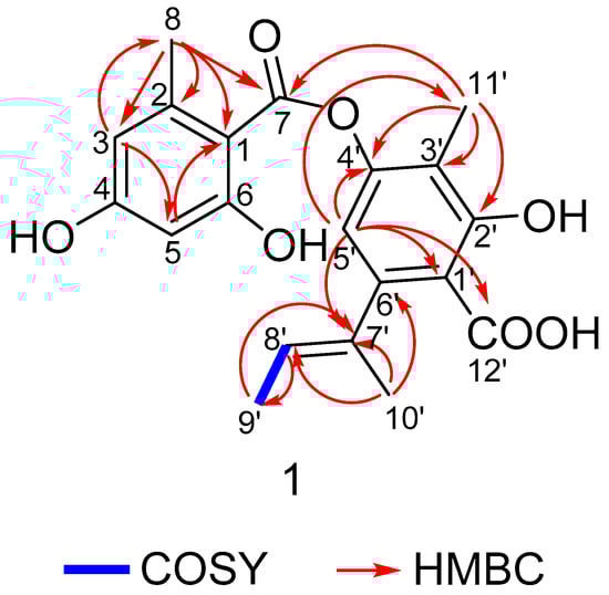 Compound (1) was isolated as a yellow amorphous solid, m.p. 166.4‒167.6 °C. Its molecular formula was determined as C20H20O7 on the basis of the analysis of HR-ESI-MS at m/z 371.1137 [M − H]− (calcd 371.1131) and NMR spectral data (see Table 1 and Supplementary Materials). It exhibited IR absorptions at 1658 and 3255 cm−1, suggesting the presence of ester carbonyl and hydroxyl moieties. Its UV (MeOH) λmax (log ε) was 217 (5.88), 266 (5.51), and 305 (5.27). The 1H-NMR spectrum showed the resonances of four methyls at δH 1.70 (3H, dd, J = 6.7, 0.8 Hz), 1.92 (3H, s), 2.01 (3H, s), and 2.59 (3H, s) and an olefinic and three aromatic protons groups were at δH 5.34 (1H, dq, J = 6.8, 1.3 Hz), 6.19 (1H, d, J = 2.4 Hz), 6.25 (1H, s), and 6.28 (1H, dd, J = 2.0, 0.5 Hz). The 13C-NMR spectrum exhibited a total of 20 carbon resonances, containing 12 aromatic carbons, 1 ester carbonyl, 1 carboxyl, 4 methyl groups, 1 tertiary carbon, and 1 quaternary carbon for aromatic rings, and 1-methyl-1-propenyl moiety, which accounted for all 11 degrees of unsaturation. As we know, 1H–1H couplings substantially reduce intensities of the C–H correlation. Therefore, it is hard or impossible to observe nJCH correlations for n > 3. However, the longer range nJCH couplings could be observed for some compounds with few or no 1H–1H couplings like depsidones, which can reach 4JCH, 5JCH, and 7JCH couplings [,]. The HMBC correlations from H-8 to C-1, C-2, C-3, and C-7 (4JCH); from H-3 to C-1, C-2, and C-5; and from H-5 to C-1 established a 2-methyl-4,6-dihydroxyl-benzoyl moiety (aromatic ring A). The key HMBC correlation from H-11′ to C-2′, C-3′, and C-4′ and from H-5′ to C-1′, C-2′ (4JCH), C-3′, C-4′, C-7′, and C-12′ (COOH) (4JCH) created a 2-hydroxy-3-methyl-4-oxygenated group-6-acyl-benzoic acid moiety (aromatic ring C). The HMBC correlations from H-5′ to C-7 and from H-10′ to C-6′, C-7′ and C-8′, together with the 1H–1H COSY correlations from H-8′ to H-9′, established a moiety of 1-methyl-1-propenyl and attached it to C-6′ of ring C. Finally, the two rings were connected by the HMBC correlation from H-11′ to C-7(5JCH) to determine its structure (Figure 2). As for the configuration of the 2-but-2-enyl group, it has been observed by Beach and Richards that O-methylisonidulin (trans-configuration) has a higher splitting constant than nidulin (cis-configuration) for the interaction between the two vinyl methyls across the double bond []. Compound 1 possesses a splitting constant of 0.8 Hz close to nidulin with a splitting constant of 1.0 Hz, indicating that the 2-but-2-enyl group in 1 is assigned to be cis-configuration. Therefore, the structure of 1 was determined to be (E)-6-(but-2-en-2-yl)-4-((2,4-dihydroxy-6-methylbenzoyl)oxy)-2-hydroxy-3-methylbenzoic acid, named aspergillusidone G. This is the first time this compound has been reported. Structurally, it is a ring B-opened derivative of aspergillusidone A (compound 9) [].