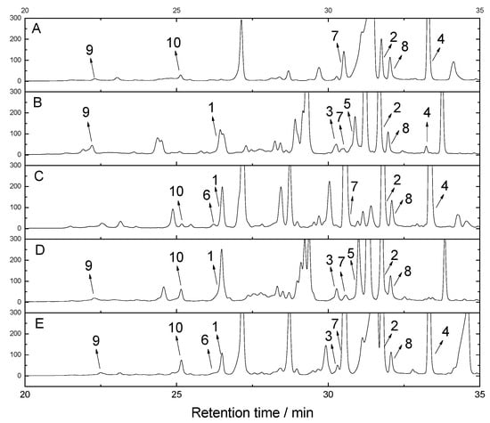 The HPLC fingerprints recorded at 254 nm of Aspergillus unguis fermentation extracts when cultured under different conditions. (A) A. unguis in potato sucrose broth (PSB) medium; (B) A. unguis in PSB medium + NaBr; (C) A. unguis in PSB medium + procaine; (D) A. unguis in PSB medium + procaine + NaBr; (E) A. unguis treat with plasma in PSB medium.