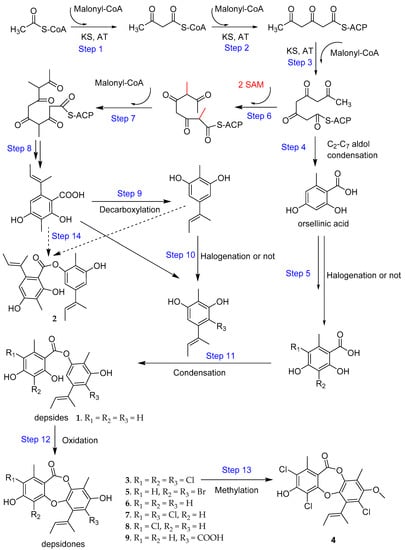 Probable proposed biosynthetic pathways for depsides 1‒2 and depsidones 3‒9, KS, ketosynthase; AT, acytransferase; ACP, acyl carrier protein; SAM, S-Adenosyl methionione [,,,].