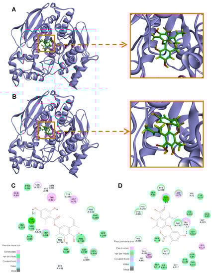 To explain the different potency of highly similar compounds 1 and 9 towards AChE, a docking study was performed using Discovery Studio 3.5 software (BIOVIA Co., Ltd., San Diego, CA, USA). Docking results showed that the docked pose of 1 with AChE has a negative CDOCKER energy of 10.02 kcal/mol and a negative CDOCKER interaction energy of 44.43 kcal/mol. It mainly formed one hydrogen bond with AChE, i.e., the one between 4-OH and Tyr 70 (bond length 5.1 Å) (Figure 5A,C). Electrostatic (Tyr 121, Ser 122, Trp 84, etc.) and van der Waals (Trp 84, Tyr 334, Phe 331, Phe 330, etc.) interactions exist between 1 and AChE. As for compound 9, its docked pose with AChE has a negative CDOCKER energy of −7.86 kcal/mol and a negative CDOCKER interaction energy of 46.07 kcal/mol. Compound 9 formed two hydrogen bonds between its 4-OH and Trp 84 (4.7 Å) and between its 1′-COOH and Tyr 121 (6.5 Å) (Figure 5B,D). Besides, electrostatic (Tyr 121, Trp 84, etc.) and van der Waals (Tyr 334, Phe 331, Phe 330, Ser 122, etc.) interactions also exist between 9 and AChE. All these interactions are known to be formed between the potent AChE inhibitors and the enzyme active site [,,,]. In comparison, compound 9 possesses a higher negative CDOCKER interaction energy and stronger interactions with different sites within the AChE active site than 1, which explains its higher activity.