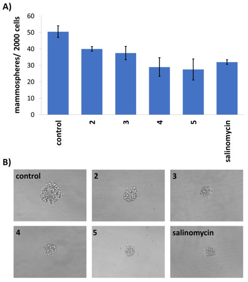 (A) Representation of the number of mammospheres formed from HMLER-shEcad cell suspensions treated with 2–5 or salinomycin for 5 days at their respective IC20 values. Standard deviation was used to calculate the associated errors. (B) Bright-field images (taken using an inverted microscope) representative of untreated HMLER-shEcad mammospheres and those treated with 2–5 or salinomycin for 5 days at their respective IC20 values (×20 magnification). (C) Compound concentration versus percentage mammosphere viability plots for 2–5 against HMLER-shEcad mammospheres (5 days incubation).