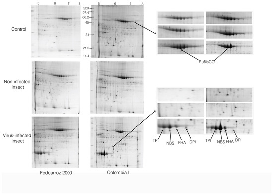 Metabolism-related proteins. The Rieske iron–sulfur protein family showed a decrease in abundance under insect and virus stress. Some of the proteins found in the present study have been reported by Brizard et al. [21], who studied the interaction of the yellow mottle virus in rice. On the other hand, the production of ROS in stress can be increased by photosynthesis, respiration, and NADPH oxidation processes, and as a result of the rupture of photosystems [22], which is why most of the amount of Rubisco subunits identified in this work may be related to the stress generated by the virus in plants of the Colombia I variety.