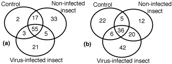 Venn diagram representing differentially expressed spots for the three experimental groups: treatment 1 (control group), treatment 2 (non-infected insect), and treatment 3 (insect infected with RHBV). (a) Fedearroz 2000 variety; (b) Colombia I variety.