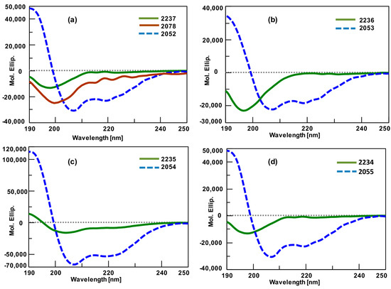 Circular dichroism of linear and conformationally restricted peptides: (a) Linear peptides 1 (2237 and 2078), and Helix 1 (2052); (b) Linear peptide 2 (2236) and Helix 2 (2053); (c) Linear peptide 3 (2235) and Helix 3 (2054); (d) Linear peptide 4 (2234) and Helix 4 (2055).