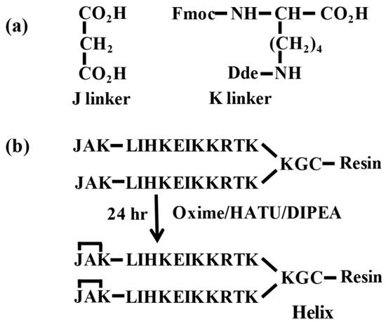 (a) Structure of J and K linkers. (b) Insertion of nucleation site into a helix-like peptide during solid-phase synthesis.