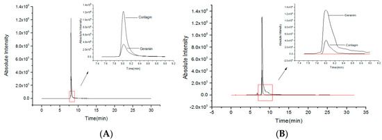 The quantification of geraniin and corilagin from rambutan peel phenolics (RPP) by a ultra-high performance liquid chromatography coupled with triple quadruple mass spectrometry (UPLC-QQQ-MS). (A) The standards, (B) RPP.