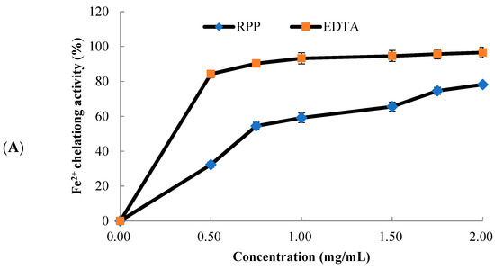 The chelating activities of RPP and ethylene diamine tetraacetic acid (EDTA) on Fe2+ are shown in Figure 2A. The Fe2+-chelating activities of RPP and EDTA increased as the concentration used increased. At concentrations of 0–1 mg/mL, the chelating activities showed significant improvement. The Fe2+-chelating activities of RPP and EDTA were 78.6% and 96.6%, respectively, at a concentration of 2.0 mg/mL. The EC50 value of RPP was 0.80 mg/mL.
