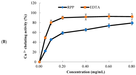 Iron- (A) and copper- (B) chelating activities of RPP with positive control of ethylene diamine tetraacetic acid (EDTA). Values represent the mean ± standard error of three determinations.