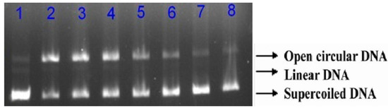 Protection of RPP with different concentrations on 2,2-azobis-2-methylpropion-amidine dihydrochloride (AAPH)-induced supercoiled plasmid DNA strand breakage. Lanes: 1, control (DNA only); 2, DNA + AAPH; 3–4, DNA + AAPH + RPP of 20 μg/mL; 5–6, DNA + AAPH + RPP of 40 μg/mL; 7–8, DNA + AAPH + RPP of 60 μg/mL.