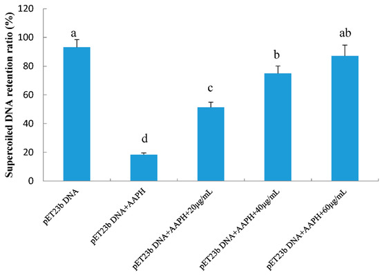 DNA is a sensitive biotarget for free radical-mediated oxidative damage. Free radicals oxidize the native form of DNA, which can be determined by its conversion to a nicked circular or linear form via single- or double-strand breaks [23]. Such a process has effects on DNA replication and transcription, which could lead to mutagenesis, carcinogenesis, and cytotoxicity. Research has recently studied the inhibition activity of radical-induced supercoiled plasmid DNA-strand damage to evaluate the bioactivity of natural products. The protective effects of RPP on peroxyl radical-induced supercoiled plasmid DNA strand breakage were evaluated in this study (Figure 4). The supercoiled plasmid DNA strand was damaged by AAPH treatment. When incorporated with RPP at different concentrations (20, 40, and 60 μg/mL), the formation of nicked DNA forms was reduced, and the native form increased. We quantified the exact supercoiled DNA retention ratios of all samples (Figure 5), and the results indicated that retention of the native DNA form by RPP increased in a dose-dependent manner, and supercoiled DNA of 51.4%, 74.9%, and 87.1% were noted with three RPP concentrations.