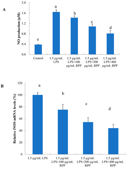 RAW 264.7 cells were stimulated with 1.5 μg/mL LPS for 12 h and seeded onto a 12-well plate at 1 mL (4 × 104) per well for 24 h. The cells were then incubated with RPP samples of different concentrations for 12 h. The extraction of total RNA and the relative quantification of iNOS gene expression were assayed according to a previous report [25].