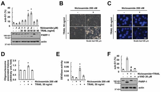 Niclosamide combined with TRAIL enhances apoptosis in Caki cells. (A) Apoptosis levels were detected by flow cytometry in Caki cells after treatment with niclosamide (100, 200 nM) and/or TRAIL (30, 50 ng/mL) for 24 h. (B–E) Representative image (B), 4′,6′-diamidino-2-phenylindole (DAPI) image (C), DNA fragmentation assay (D), and caspase activity assay (E) were determined by microscopy or assay kit in Caki cells after incubation with 200 nM niclosamide and/or 50 ng/mL TRAIL for 24 h. (F) Apoptosis levels were detected by flow cytometry in Caki cells after pretreatment with 20 μM z-VAD-fmk (z-VAD) for 30 min, followed by treatment with 200 nM niclosamide and 50 ng/mL TRAIL for 24 h. Western blotting detects the protein expression (A,F). The values in graph (A,D–F) represent the mean ± SEM of three independent samples. * p < 0.01 compared to the control. # p < 0.01 compared to the niclosamide plus TRAIL.