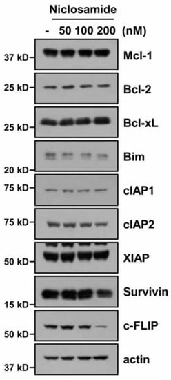 Niclosamide is an oral anthelmintic drug that is used to treat parasite infections. It exhibits anti-cancer activity against various cancer cell types by inhibiting multiple signaling pathways. Niclosamide inhibits the Wnt/β-catenin pathway, resulting in the suppression of cell proliferation in breast, glioma, ovarian, and renal carcinoma cells [,,,]. Moreover, niclosamide down-regulates Notch signaling and induces apoptosis in colon cancer []. In addition, STAT3 signaling is inhibited by niclosamide treatment, leading to cell arrest, growth inhibition, and apoptosis in head and neck, lung, and breast cancer [,,]. Furthermore, the effect of niclosamide is up-regulated sensitization by combined treatment with other drugs. For example, niclosamide increases radio-sensitizing effects through down-regulation of Wnt/β-catenin signaling in breast cancer, and the disruption of STAT3 activity in human lung cancer, respectively [,]. Niclosamide overcomes the resistance to platinum-based antineoplastic drugs, such as cisplatin or carboplatin, against drug-resistance cancer cells [,,]. However, the sensitizing effect and molecular mechanisms of niclosamide in TRAIL-resistant cancer cells has not yet been elucidated.