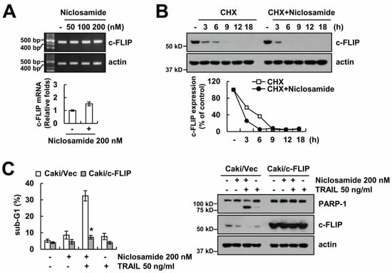 The down-regulation of c-FLIP is associated with the reduction of TRAIL resistance by niclosamide. (A) The messenger RNA (mRNA) expression was determined by reverse transcription polymerase chain reaction (RT-PCR) (upper panel) and quantitative polymerase chain reaction (qPCR) (lower panel) in Caki cells after treatment with niclosamide (50–200 nM) for 24 h. (B) The protein expression was determined by Western blotting in Caki cells after treatment with 200 nM niclosamide in the presence or absence of 20 μg/mL cycloheximide (CHX) for 3–18 h. The band intensity was measured using ImageJ. (C) Apoptosis levels and protein expression were determined by flow cytometry and Western blotting in Vector cells (Caki/Vec) and in c-FLIP-overexpressed cells (Caki/c-FLIP) after treatment with 200 nM niclosamide, and/or 50 ng/mL TRAIL for 24 h. The values in graph (A,C) represent the mean ± SEM of three independent samples. * p < 0.01 compared to niclosamide plus TRAIL-treated Caki/Vector.