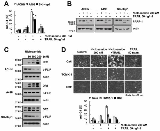 The effects of the niclosamide plus TRAIL on apoptosis in other cancer and normal cells. (A,B) Apoptosis levels and protein expressions were determined by flow cytometry and Western blotting in ACHN, A498, and SK-Hep1 cells after treatment with 200 nM niclosamide and/or 50 ng/mL TRAIL for 24 h. (C) Protein expression was determined by Western blotting in ACHN, A498, and SK-Hep1 cells after treatment with niclosamide (50–200 nM) for 24 h. (D) Representative image and apoptosis levels were detected by interference light microscopy and flow cytometry in Caki, TCMK-1, and HSF cells after treatment with 200 nM niclosamide and/or 50 ng/mL TRAIL for 24 h. The values in the graph (A,D) represent the mean ± SEM of three independent samples. * p < 0.01 compared to the control.
