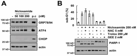 Niclosamide plus TRAIL-induced apoptosis is independent of endoplasmic reticulum (ER) stress and reactive oxygen species (ROS) generation. (A) The protein expression were determined by Western blotting in Caki cells after treatment with niclosamide (50–200 nM) or 2 μM brefeldin A (positive control; p.c.) for 9 h. (B) The apoptosis levels and protein expression were detected by flow cytometry and Western blotting in Caki cells after pretreatment with 5 mM NAC, 200 μM trolox, and 2 mM GEE for 30 min, followed by treatment with 200 nM niclosamide and 50 ng/mL TRAIL for 24 h. The values in graph (B) represent the mean ± SEM of three independent samples.