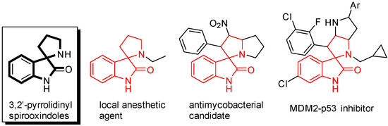 The 3,2′-pyrrolidinyl spirooxindoles and their 6- or 7- membered analogous are among one of the most important privileged structural units, whicH-Not only frequently appear in a plethora of biologically active oxindole alkaloids, but also in several pharmaceuticals [1,2,3,4,5,6,7,8,9,10,11,12,13]. As one of the most common such skeletons, 3,2′-pyrrolidinyl spirooxindoles shown a wide spectrum of notable bioactivities [14,15,16,17], such as local anesthetic and antimycobacterial effects, and binding to the MDM2 protein to interrupt its protein-protein interaction with TP53 (Figure 1).