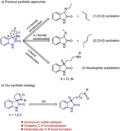 Considering their potential pharmaceutical value, decades of research have introduced several synthetic methods to assemble this type of spirooxindole compounds. However, almost all published approaches are based on the powerful (3 + 2) cyclization to construct the five-membered pyrrolidinyl ring [18,19,20,21,22,23,24,25,26] (Scheme 1). For example, metal-catalyzed and organocatalytic cycloadditions of azomethine imines derived from isatins with a variety of dipolarophiles have been successfully developed (a,b-bond construction, pathway (1)). Alternatively, a nucleophilic attack of 1,3-ylides on isatin-3-imine derivatives also led to the formation of corresponding spirooxindoles (a,c-bond construction, pathway (2)). Despite the fact that these elegant one-step assemblies are capable of producing various spirooxindoles with molecular complexity and diversity, efficient and accessible methodologies towards these synthetic targets are still in high demand. The first intramolecular nucleophilic substitution of 3-halo-2-oxindoles providing a 3,2′-pyrrolidinyl-spirooxindole intermediate was reported by Cohen et al. almost 30 years ago (d-bond construction, pathway (3)) [27]. Unfortunately, almost no further development has been reported in the field of intramolecular amination. Very recently, Chen et al. described an annulation reaction of 3-bromo-2-oxindoles generating spirocyclic oxindoles, in which a cinchona alkaloid catalyzed amination was involved [27]. Thus, the potential application of simpler 3-H-2-oxindole precursors, which would provide the spirooxindole derivatives via a challenging intramolecular oxidative amination approach (pathway (4)), has not succeeded [28,29].
