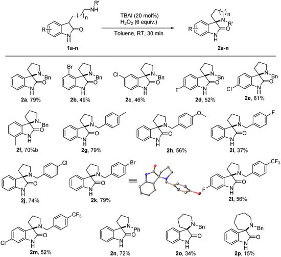 On the other hand, oxidative C–H/N–H coupling is a direct approach for the effective construction of C-N bonds [30,31,32,33,34,35]. However, most of the existing methods typically require the use of transition metals, which has hindered their practical application [30,31,32,33,34,35]. Therefore, the development of new C-N bond formation reactions under metal-free conditions is also in high demand [36,37,38,39,40,41]. Recently, the catalytic system with I− or I2 and a terminal oxidant has emerged as an environmentally benign oxidative system for a range of transformations, such as etherification, lactonization, and others [42,43,44,45,46,47,48,49,50,51]. Based on our continuing interest in the synthesis of 2-oxindole derivatives and the application of iodine/iodide catalysis [52,53,54,55,56,57], we herein report our progress in the TBAI/H2O2 catalyzed intramolecular oxidative amination of 3-aminoalkyl 2-oxindoles to give 3,2′-pyrrolidinyl-spirooxindoles and their 6/7-membered analogs [58,59,60,61,62].