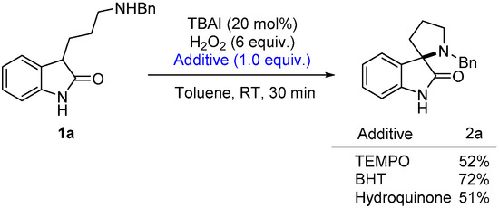 Some control experiments were conducted in order to elucidate the mechanism. Previous reports [58,59,60,61,62] have suggested that a radical process was involved in iodide/oxidant catalyzed C-N bond formation. However, when a stoichiometric amount of radical inhibitors, like TEMPO, BHT and hydroquinone, was used, the cyclization of 1a proceeded smoothly and afforded the desired product 2a in comparable yields (Scheme 4), indicating a complete different pathway.