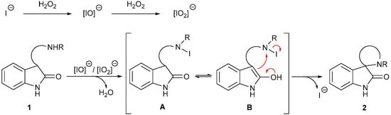 On the basis of the experimental results and recent studies [64,65,66], a possible stepwise mechanism is proposed (Scheme 5). First, two hypervalent iodine species, i.e., IO– and IO2− were likely generated by the oxidation of iodide with H2O2. Those hypervalent iodines then reacted with aminoalkyl 2-oxindoles 1 to form an iodoamino intermediate A, which was in equilibrium with its enolate B. The latter readily underwent an intramolecular substitution to afford the cyclization product 2, while releasing the iodide, which further underwent oxidation to regenerate the reactive hypervalent iodine species.