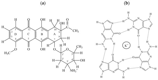 (a) Chemical structure of daunomycin and; (b) G-tetrad in the presence of K+ ions.