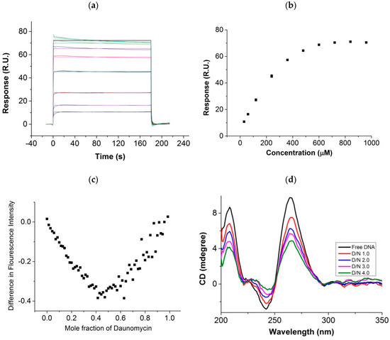 (a) Results of surface plasmon resonance experiments for the binding of daunomycin to [d-(TTGGGGT)]4. Sensograms obtained for free daunomycin concentration from 30 µM (bottom) to 960 µM (top), using HEPES buffer with 100 mM of KCl at 25 °C; (b) Binding plot of steady-state response (R.U.) versus concentration of daunomycin (µM); (c) Job Plot for binding of daunomycin to [d-(TTGGGGT)]4 showing a difference in the fluorescent intensity of bound and unbound daunomycin as a function of the mole fraction of daunomycin. The total concentration of daunomycin and [d-(TTGGGGT)]4 was kept constant as 7 µM in 10 mM of phosphate buffer (KBPES) containing 100 mM of KCl at 25 °C; (d) Circular dichroism spectra of 15 µM of free [d-(TTGGGGT)]4 and its complex at Daunomycin (D) to Nucleic acid (N) ratio, D/N = 1.0, 2.0, 3.0, and 4.0; (e) Circular dichroism spectra of 400 µM of free daunomycin and its complex with [d-(TTGGGGT)]4 at D/N = 1.0, 2.0, 3.0, and 4.0 in 10 mM of phosphate buffer containing 100 mM of KCl at 25 °C; and (f) Diffusion coefficient measurement obtained from Diffusion Ordered SpectroscopY (DOSY) spectra of free daunomycin, free [d-(TTGGGGT)]4, and daunomycin-[d-(TTGGGGT)]4 complex at D/N = 2.0 at 25 °C.