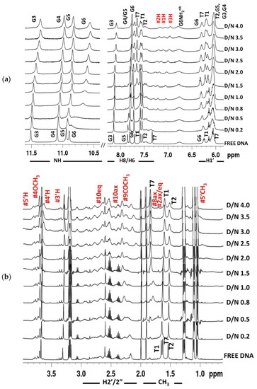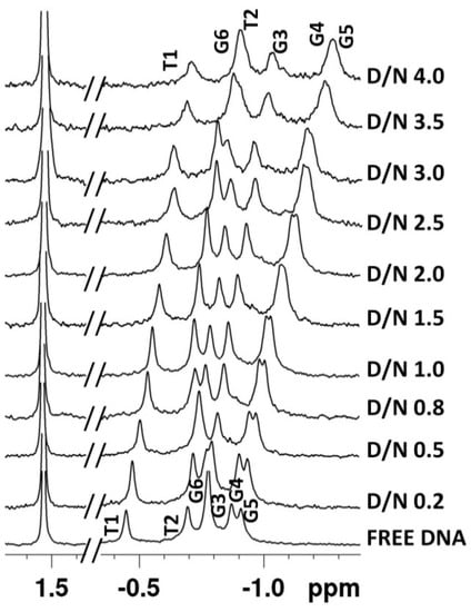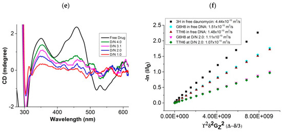 The 1H DOSY experiments showed (Figure 2f) that a diffusion constant of 1H/2H/3H protons (~4.0 × 10−10 m2/s) in free daunomycin and T7H6/G6H8 protons in free DNA (~1.5 × 10−10 m2/s) are greater than that for bound DNA (~1.0 × 10−10 m2/s) at D/N = 2.0 at 25 °C. This shows that ligand-bound DNA undergoes diffusion at a slower rate as a stable complex upon binding [21,39]. Due to the presence of two stoichiometries as evidenced by Job Plot and perhaps two binding sites, daunomycin proton signals were broadened and could not be used for calculating diffusion constants. The DOSY spectra thus confirm the formation of a stable bound complex.