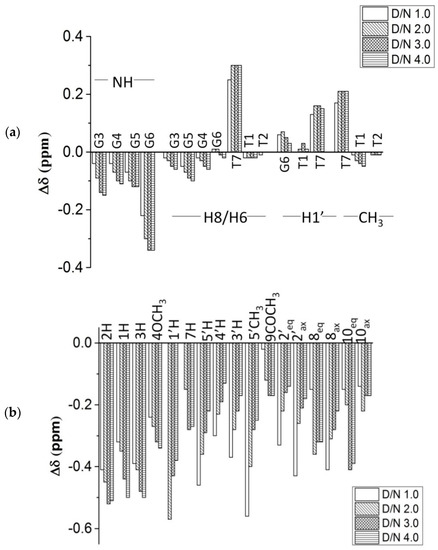 Bar diagram showing change in 1H chemical shift (Δδ) of (a) [d-(TTGGGGT)]4 protons and (b) daunomycin protons on complexation at D/N = 1.0, 2.0, 3.0 and 4.0 in 10 mM phosphate buffer with 100 mM of KCl (90% H2O + 10% D2O) at 25 °C.